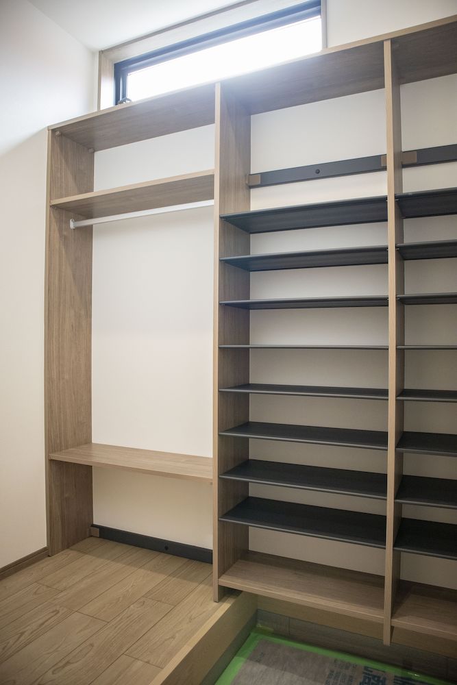 玄関収納は土間仕様だと、外で使うものを家の中に持ち込まずに済むため、衛生的で便利です。靴だけでなく傘、帽子、上着、アウトドア用品など多くのものを収納できます。
