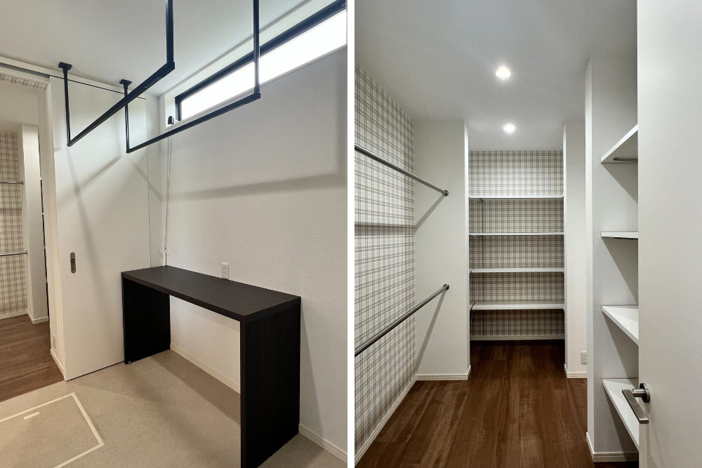 脱衣所には室内干しに便利なハンガーパイプを設置、その隣の部屋にファミリークローゼットを。