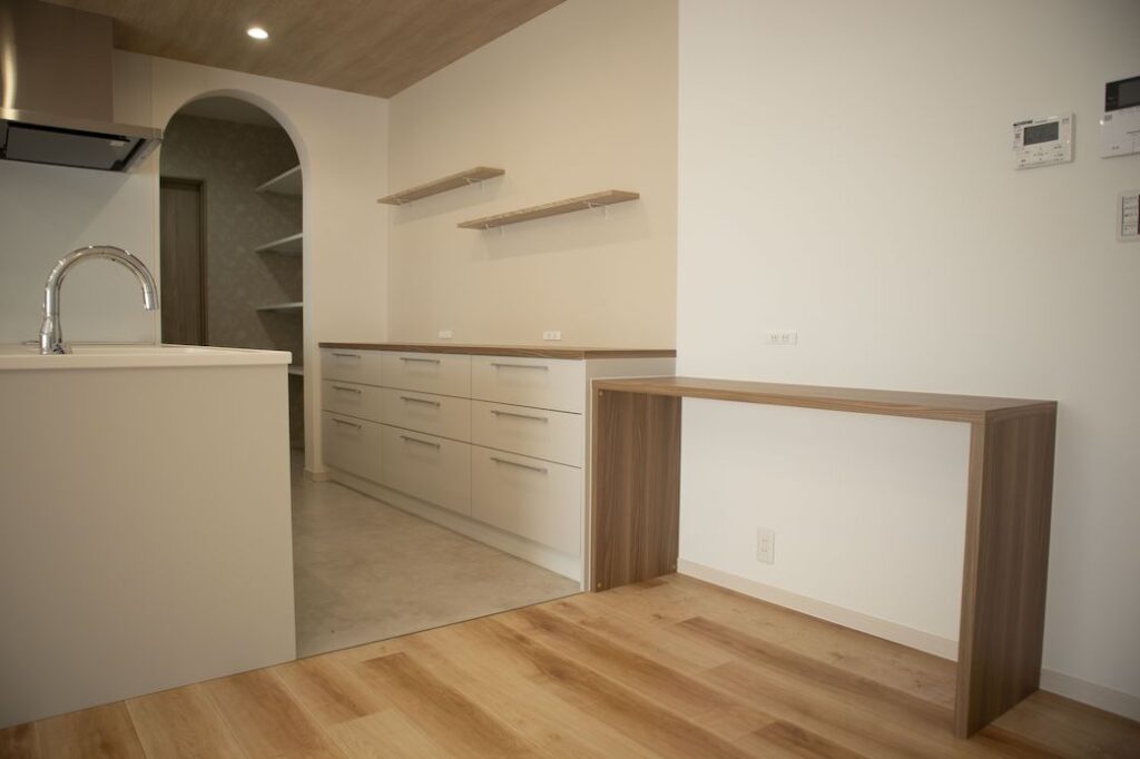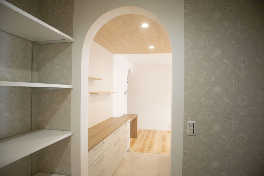 まず目を引くのが、パントリーへとつながるアーチ状の開口✨
