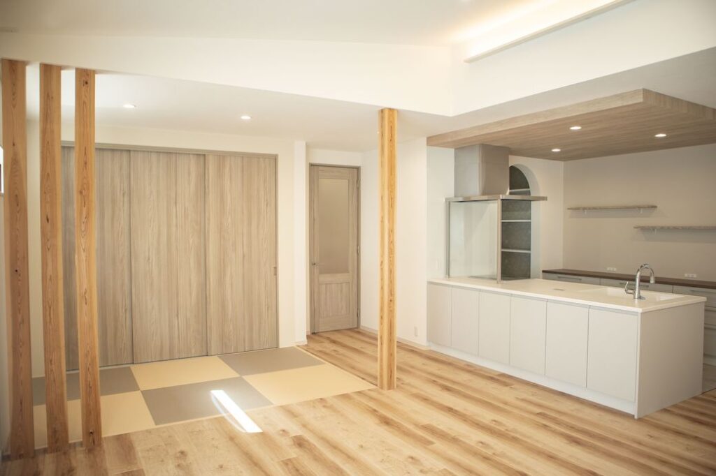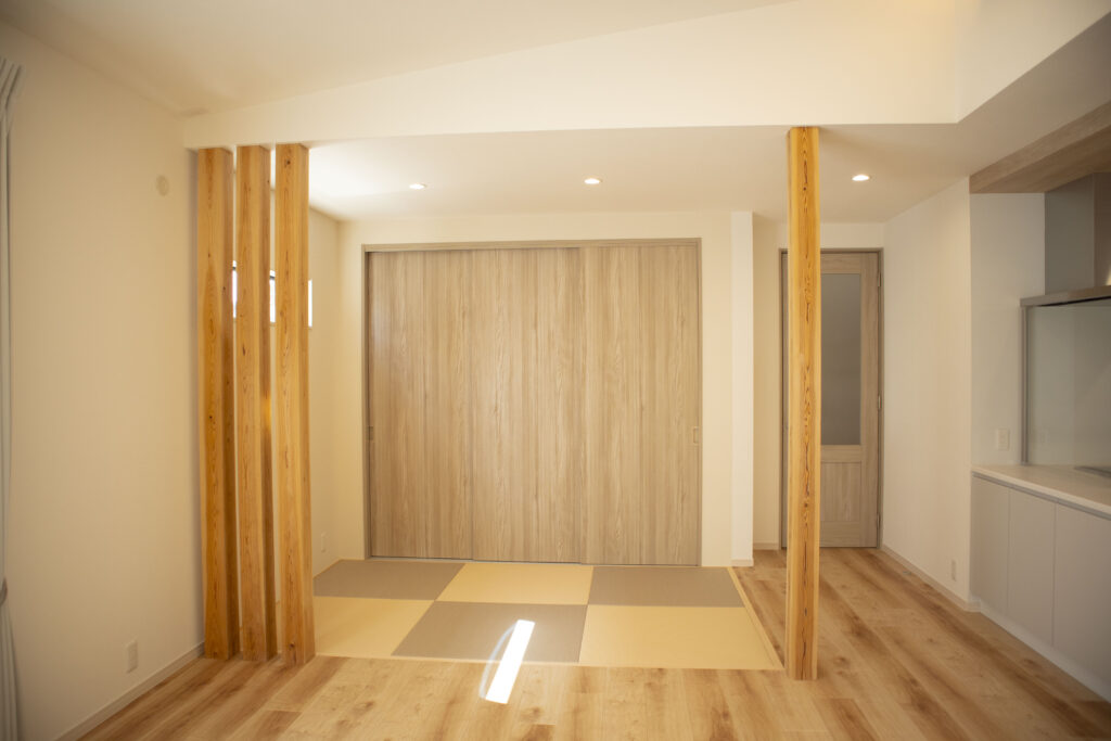 仕切り戸ではなく、柱でゆるやかに空間を区切ることで、完全に閉じず開放感を保った設計になっています。