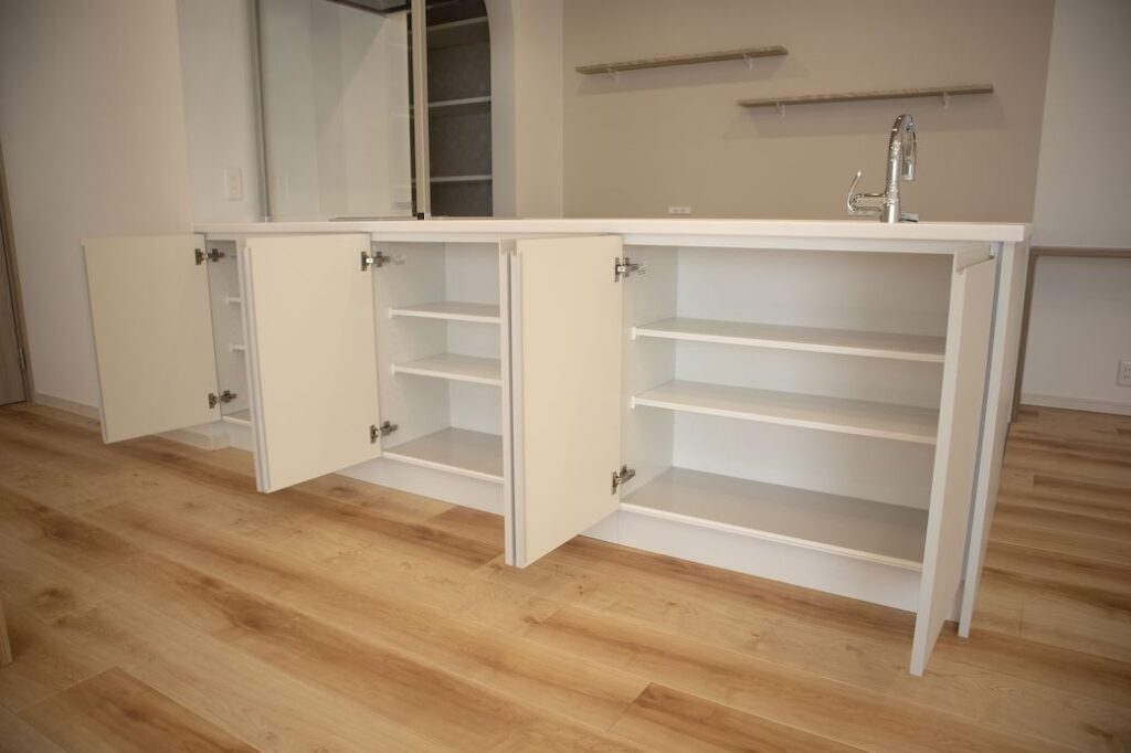 大容量の収納もあり、来客時でも空間をすっきり見せることができ、見た目の美しさと実用性を両立しています。